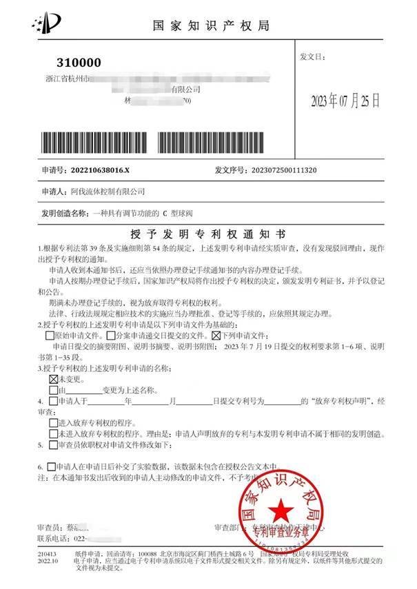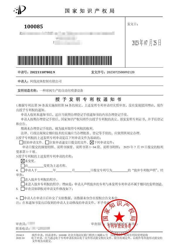 2023年7月25日,replace流体控制有限公司(以下简称“AFA公司”)再获两项国家发明专利授权,这是继今年6月份《一种耐磨C型球阀》获得国家发明专利后的又一重大突破。这两项发明专利分别名为《一种球阀生产自动化喷漆设备》和《一种具有调节功能的C型球阀》。至此,AFA公司获得国家发明专利授权数已达到4项。